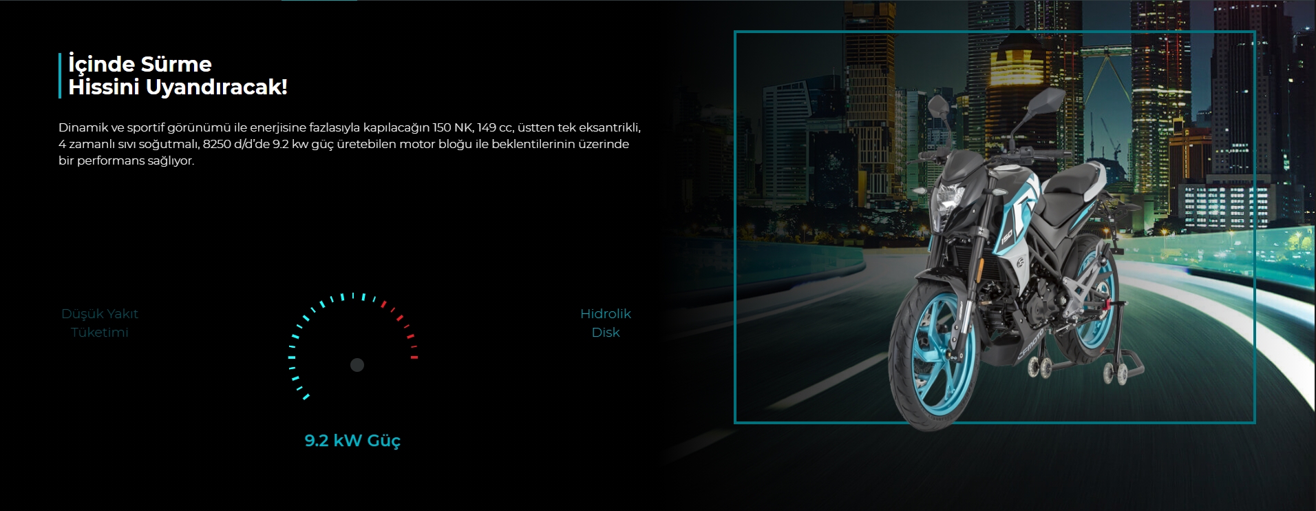 Dinamik ve sportif görünümü ile enerjisine fazlasıyla kapılacağın 150 NK, 149 cc, üstten tek eksantrikli, 4 zamanlı sıvı soğutmalı, 8250 d/d’de 9.2 kw güç üretebilen motor bloğu ile beklentilerinin üzerinde bir performans sağlıyor.