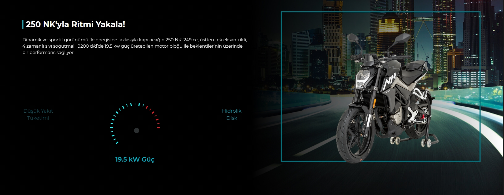 Dinamik ve sportif görünümü ile enerjisine fazlasıyla kapılacağın 250 NK, 249 cc, üstten tek eksantrikli, 4 zamanlı sıvı soğutmalı, 9200 d/d’de 19.5 kw güç üretebilen motor bloğu ile beklentilerinin üzerinde bir performans sağlıyor.